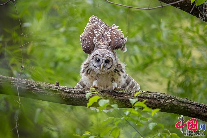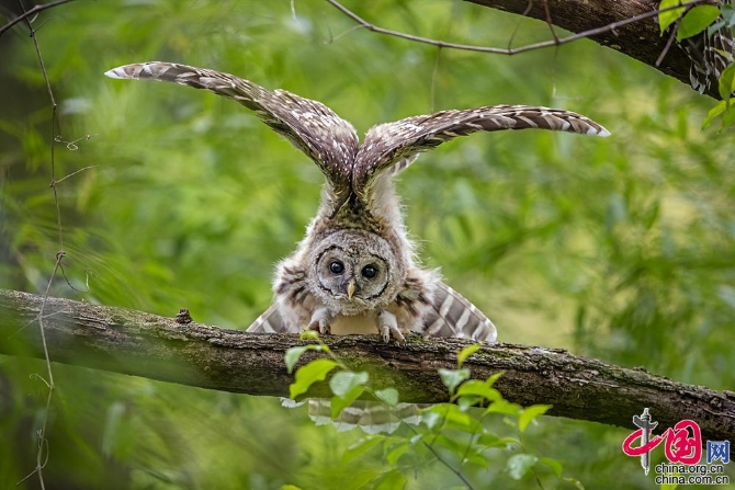 7日,美国巴尔的摩,市中心一座小森林公园里的小猫头鹰被绿色的树叶包围。它在头顶展开翅膀,看起来像戴了一顶羽毛帽子。(图片来源:视觉中国)