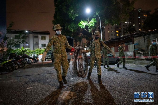 7月10日深夜,士兵在马来西亚吉隆坡郊区一个实行“加强行动管制令”的社区安装铁丝网。新华社发(张纹综摄)