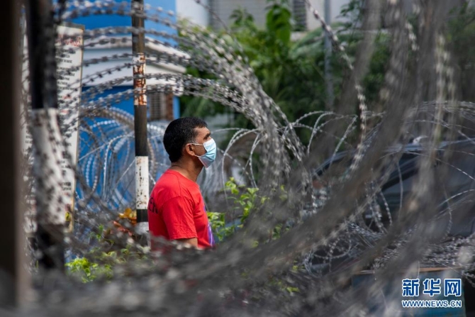 7月11日,在马来西亚吉隆坡郊区一个实行“加强行动管制令”的社区,一名居民隔着铁丝网向外张望。新华社发(张纹综摄)