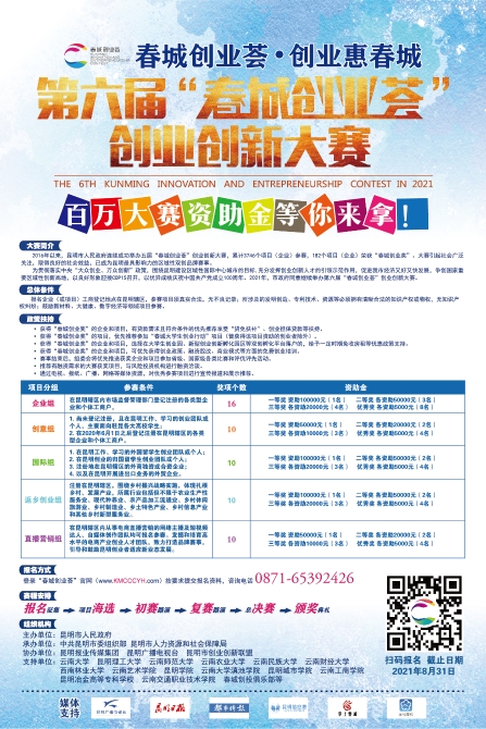 本次大赛报名将于8月31日截止,参赛项目可根据自身情况,从5个组别中选择适合的组别报名,不得交叉、重复报名,报名成功后不得更换项目。更多详情,登录“春城创业荟”官方网站了解,或拨打0871-65392426咨询,欢迎社会各界创业者积极报名参赛。(6686体育 记者张艺璇)