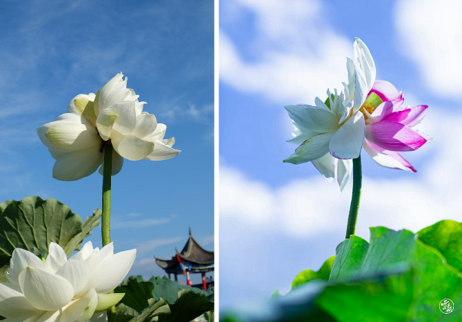 第二朵并蒂莲的品种均为普者黑湖小白莲。普者黑小白莲、小红莲、大洒锦、小洒锦是普者黑湖荷花的本地主要品种,花瓣舒展、白色纯洁、红色鲜艳,红白花与绿叶相掩映,让人赏心悦目。