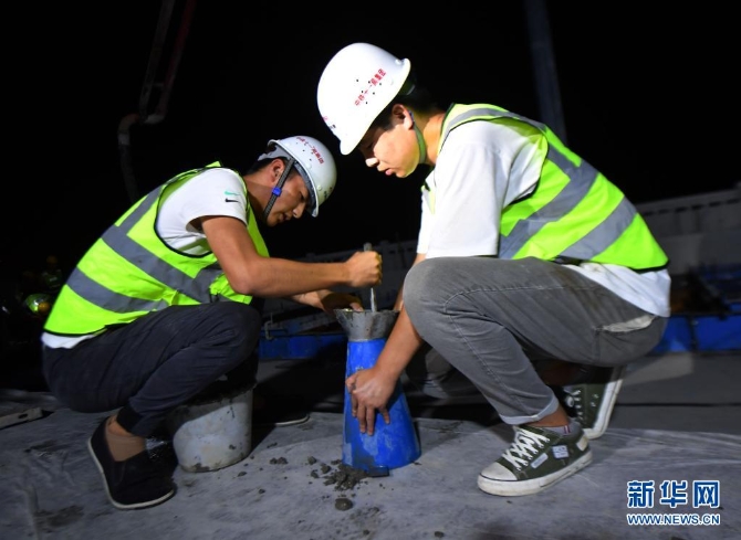 7月14日,中铁十一局建设者对混凝土坍落度进行试验检测。