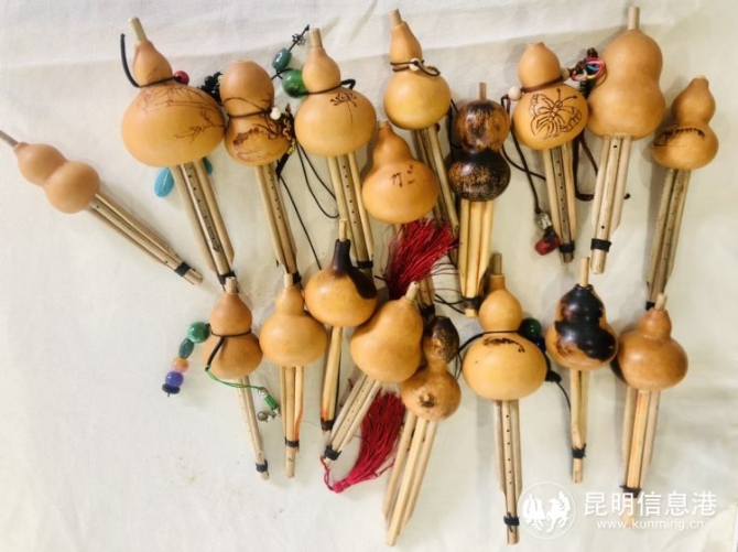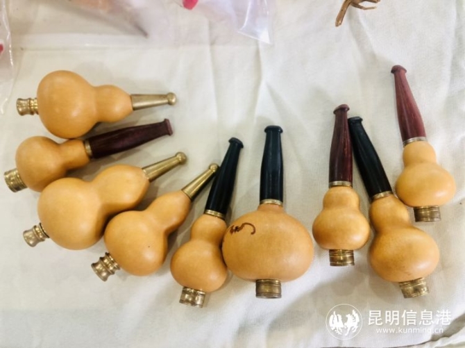 非物质文化遗产葫芦雕绘传承人徐孝国也来到展览馆,吉它葫芦丝,压板葫芦,三弦葫芦、古筝葫芦、中阮葫芦、手鼓葫芦……由徐孝国雕绘而成的以葫芦作为音响体的乐器受到了社会各界的喜爱,被中央音乐学院指定为云南省葫芦文化乐器专用提供商。