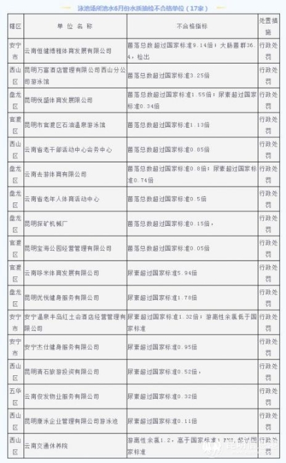 游泳场所池水6月份水质抽检不合格单位(17家)