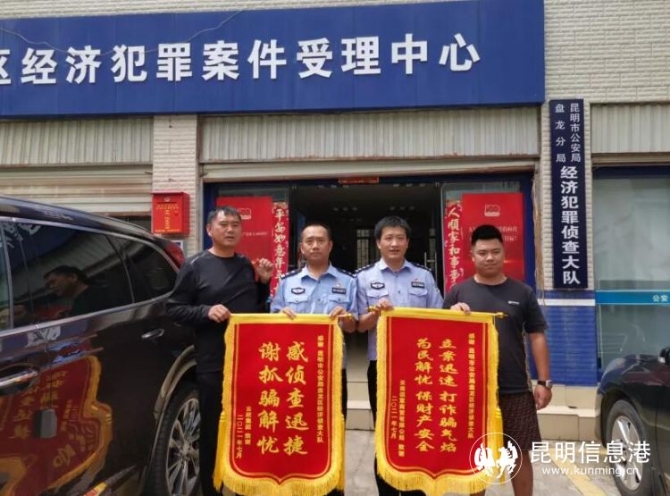 7月13日,其中两家租车公司来到经侦大队,将两面锦旗送给民警表达谢意。对民警破案神速、无私奉献,为人民群众挽回损失再三表示感激。