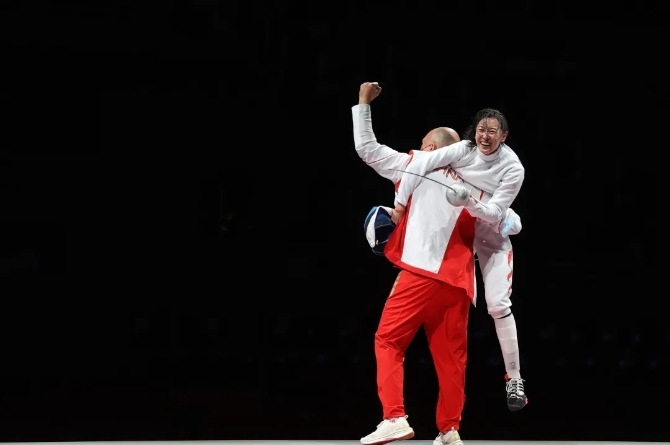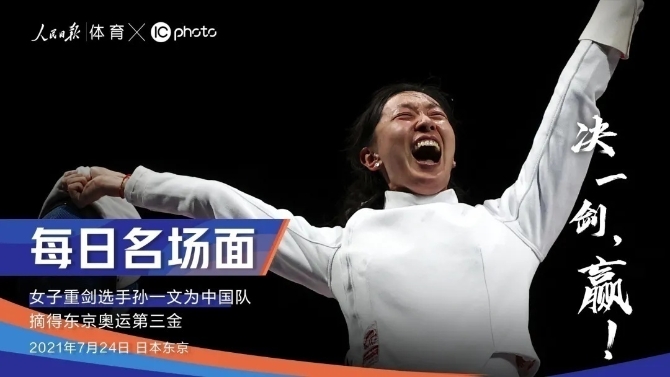 果然,孙一文刺出致胜一剑,赢得了中国女子重剑个人项目在奥运会上的首枚金牌。她和冲上剑道的教练紧紧相拥,二人激动地共同展开五星红旗,对着镜头挥洒自己的喜悦。