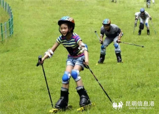 滑草场沿长廊爬上山头,此时只见碧绿的草地如挂毯呈现在眼前,到这里的游客在草地上做着各种快乐的滑翔运动,没有滑过雪的人都把这里当成了旱地滑雪练习场,胆小的选择坐在滑轮车上,从山上一路撒野冲下山坡,一路的欢声和笑语。胆大的则脚踏滑轮,双手撑杆在草地上自由地飞翔,即使摔倒也不要紧,厚实的草地就像是最好的保护。