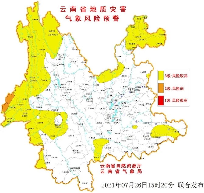 7月26日20:00~27日20:00:滇西德宏州局部发生滑坡泥石流的风险高;滇东北昭通市局部、曲靖市局部、滇西北怒江州局部、迪庆州局部、丽江市局部、大理州局部、滇西德宏州局部、滇西南临沧市、滇南普洱市局部、红河州局部、滇东南文山州局部、滇中楚雄州、昆明市发生滑坡泥石流的风险较高。