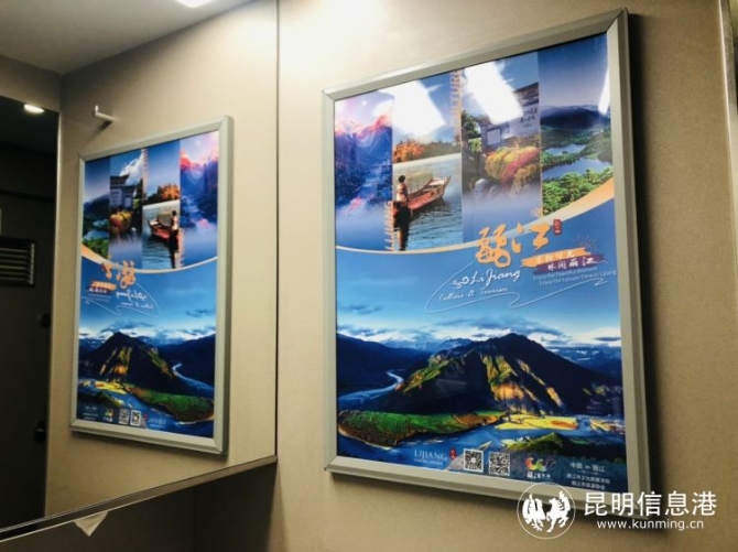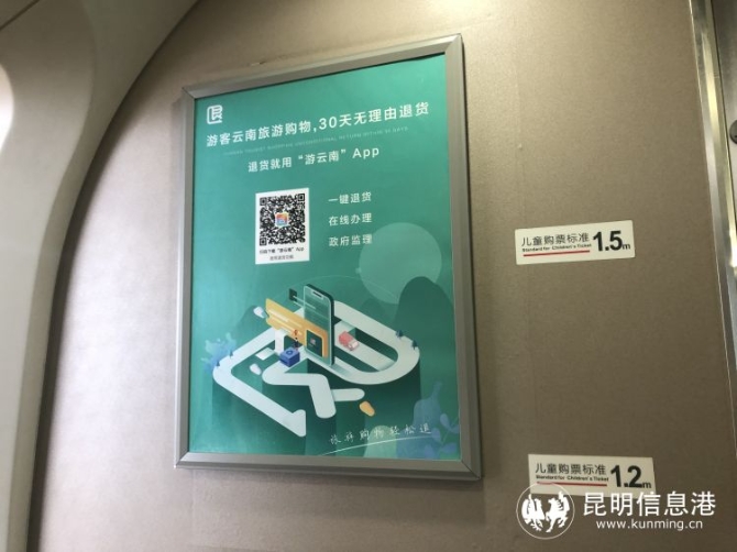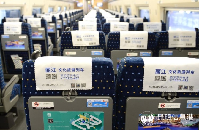 记者在发车仪式现场看到,“七彩云南文化旅游列车”(丽江号)”浸透着浓浓的云南民族文化风情。丽江古城、玉龙雪山、泸沽湖等极具代表性的自然、人文景观展示在列车LED屏、行李架等地方,列车成为了展示云南旅游景点、旅游产品的“移动长廊”。另外,“一部手机游云南”APP二维码、云南“30天无理由退货”承诺、旅游咨询电话等资讯在列车上随处可见。