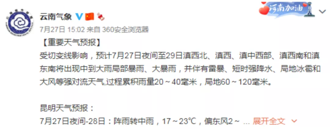 据云南气象预报,受切变线影响,预计7月27日夜间至29日滇西北、滇西、滇中西部、滇西南和滇东南将出现中到大雨局部暴雨、大暴雨,并伴有雷暴、短时强降水、局地冰雹和大风等强对流天气,过程累积雨量20~40毫米,局地60~120毫米。