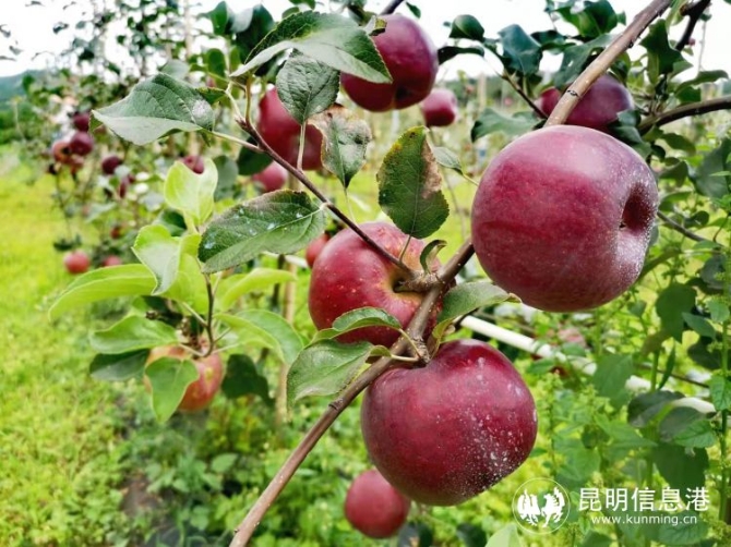 在嵩明“羊圈坡苹果”基地记者看到,只有一人多高的果树上,挂满了红艳艳的苹果,令人垂涎欲滴。熟透的苹果比成年人的拳头还要大上一圈儿,纤细的枝条几乎承受不住果实的重量,纷纷“弯下了腰”。放眼望去,整个果园就是“硕果累累”一词的生动诠释。