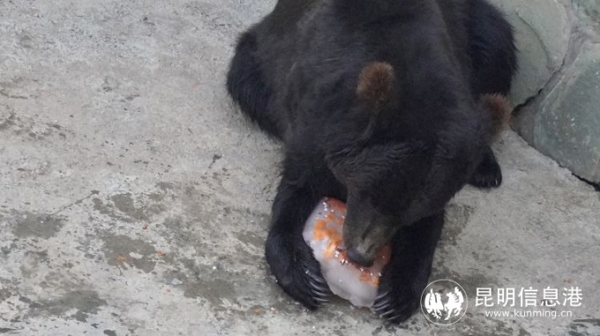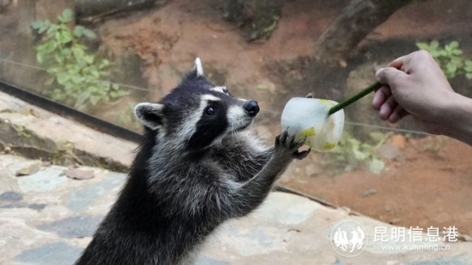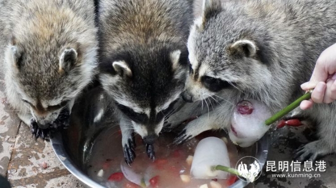据介绍,动物防暑降温工作已成为云南野生动物园的常规性工作。“不同动物的口味不同,冰棒里的水果也不同。”工作人员说。他们特意将水、西瓜汁、葡萄汁等,用形状各异的模具制作成五颜六色的冰块和冰棍,里面还有苹果片、胡萝卜片、葡萄、花生、番茄等,吃得精致的切成小块,吃得粗糙的冻成大块,让动物们乐享夏日清凉。