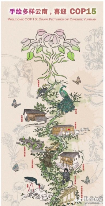结合COP15主题和云南少数民族建筑,融合民族传统文化与民族设计元素,云南财经大学“建筑视线”团队手绘了新的作品,以藤蔓围绕的形式展示云南生物多样性之美。
