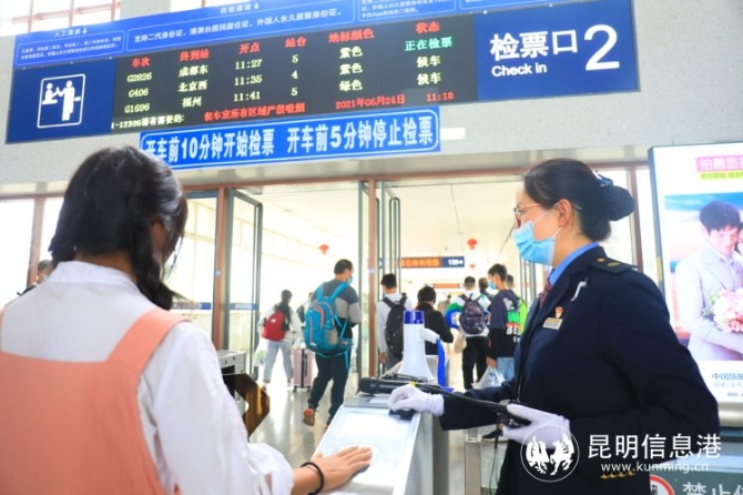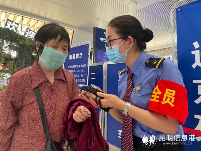 为严格落实旅客100%扫码测温进出站的相关规定,昆明局集团加大引导力度,组织进出站口工作人员逐一查验旅客行程健康码,妥善安排和处置持有非绿码的进出站旅客。为了让旅客快速便捷地扫码测温,昆明站和昆明南在进出站口增设印有“国家政务服务平台”、“云南健康码”、“通信行程卡”二维码的展架和海报,并对昆明站南北进站口进行提质改造,建立集安检、测温于一体的新型安检通道24条,让旅客拥有高效地扫码测温体验。