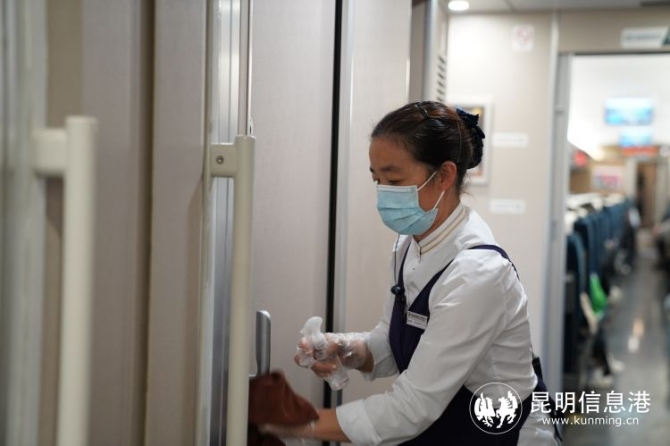 昆明局集团对每一列抵达昆明的列车进行全列预防性消毒工作,各车站组织相关人员进行24小时值守,在每日作业开始前、中午、结束后分别对车站进出站口、候车室、站台等公共区域进行2至3次全面消毒;定时对售取票机、电梯扶手按钮、垃圾桶等设备进行消毒;在进出站口、站台等区域设置隔离观察区,在售票窗口、检票口、安检、实名验证通道设置 “一米线”标识,为旅客营造安全、优质的出行环境。