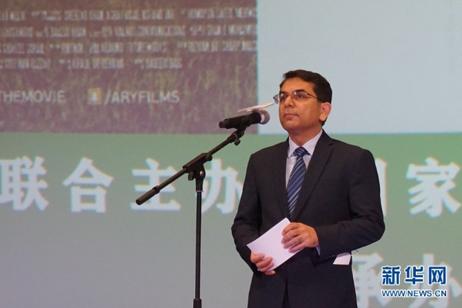 8月4日晚,巴基斯坦驻华使馆副大使艾哈迈德·法鲁克在巴基斯坦电影展开幕式上致辞。新华社记者李春宇摄