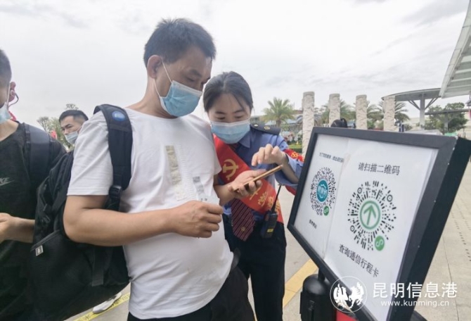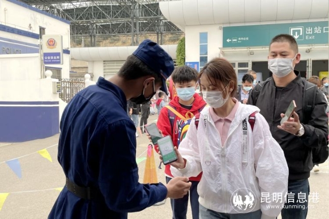 在昆明站南北进站口看到,记者看到,车站增设了印有“国家政务服务平台”“云南健康码”“通信行程卡”二维码的展架和海报,以及集安检、测温于一体的新型安检通道24条,旅客高效地扫码测温乘车。
