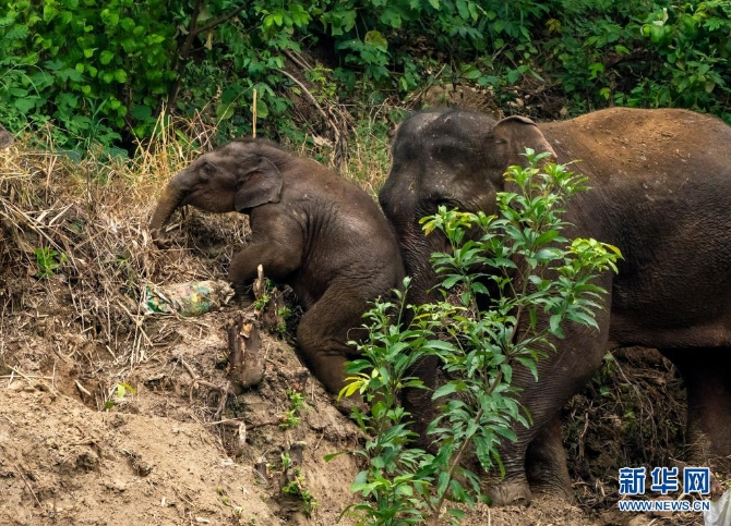 8月9日,在云南省玉溪市元江县,小象在成年大象的帮助下爬坡。新华社记者 江文耀 摄