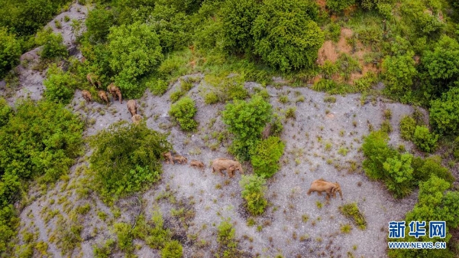 这是5月28日在云南省玉溪市峨山县境内拍摄的象群(无人机照片)。新华社记者 胡超 摄