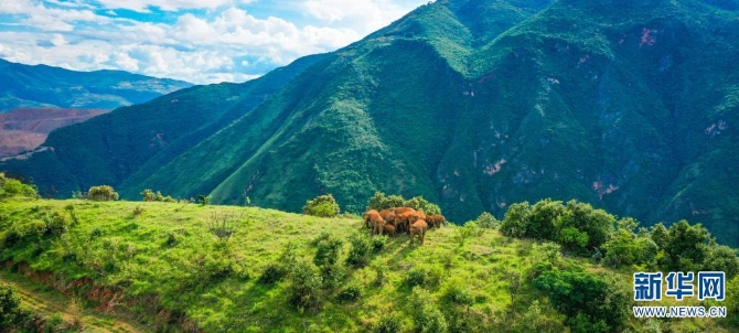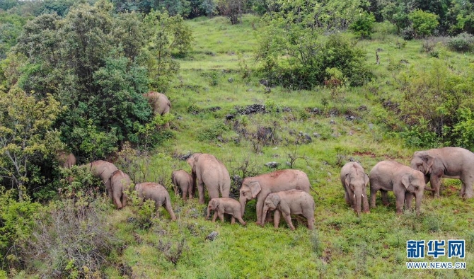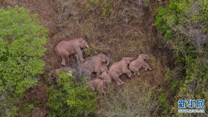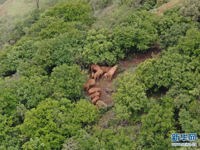 无人机拍摄到的北移亚洲象(摄于7月17日)。新华网发(云南省森林消防总队供图)