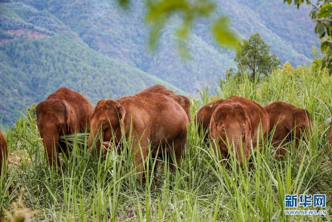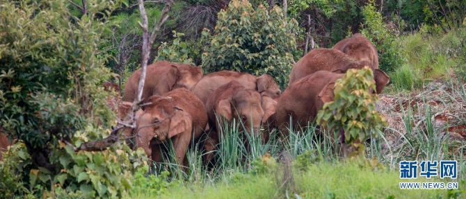 队员近距离拍摄到的高清北移亚洲象群图(摄于7月17日)。新华网发(云南省森林消防总队供图)