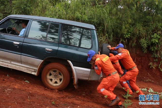 雨天车辆打滑,森林消防员们在推车(摄于7月29日)。新华网 刘东 摄