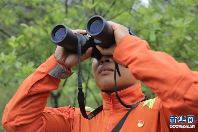 张斯捷用望远镜监测野象(摄于7月30日)。新华网 刘东 摄