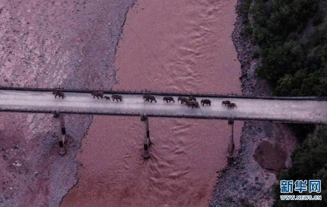 象群通过老213国道元江桥(无人机照片,8月8日摄)。新华网发(云南省森林消防总队供图)