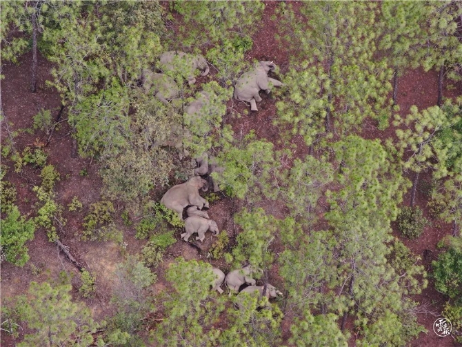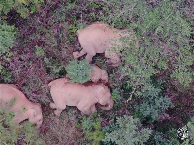 6月23日至6月24日,象群在峨山县富良棚乡附近林地内觅食活动。