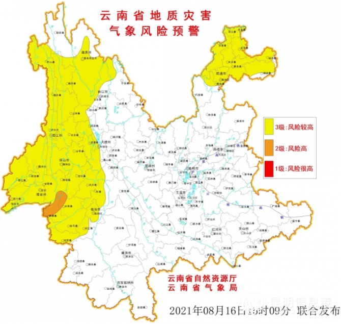 8月16日20:00~17日20:00,滇西德宏州局部、滇西南临沧市局部发生滑坡泥石流的风险高;滇东北昭通市局部、滇西北怒江州、迪庆州、丽江市、大理州局部、滇西德宏州大部、滇西南临沧市局部发生滑坡泥石流的风险较高,需注意防范。