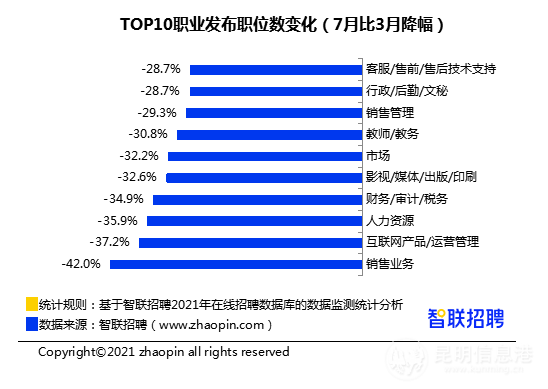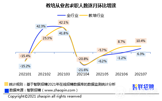 智联招聘近日发布《2021教培行业人才市场分析报告》,其中指出,随着中央进一步减轻义务教育阶段学生作业负担和校外培训负担这一“双减”政策落定,整个教培行业开始转型调整,这同时带来了人才招聘的变化,6月和7月,教培行业发布的招聘职位数分别环比下降9%、6.5%,已经呈现整体招聘规模小幅收缩趋势。
