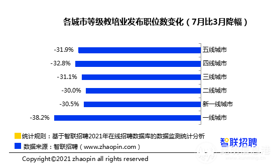 一线城市人均可支配收入高且教育消费意愿强,一直都是教培行业的重点布局之地,也是大量教培机构集中之地。随着“双减”政策落地,一线城市最先受到波及,智联招聘平台大数据显示,2021年7月一线城市教培业发布职位数比3月减少了38.2%,高于其他等级城市,其中北京降幅达49.3%,居全国首位。