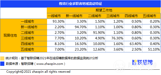 数据还显示,五线城市教培行业求职者中已离职人员比例为58.3%,四线城市教培行业求职者中已离职人员比例为57%,而一线城市教培行业求职者中已离职人员比例为46.3%。分析原因,可能一是教育头部机构进行结构缩紧,纷纷关闭低线城市业务;二是低线城市教培行业更多是经营规模较小的中小机构,对政策的反映更敏感,承受的压力更大,也更容易调整。