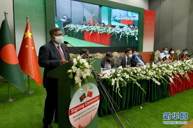 8月16日,孟加拉国外长莫门(左一)在达卡举行的签署仪式上讲话。新华社发