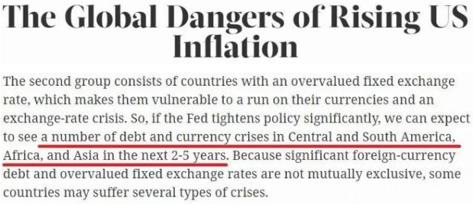 ——为了让全世界为自己不负责任的经济刺激消极后果买单,美联储凭借美元霸权不断超发货币,向世界各国输出通胀,成为“全球第一货币滥发国”,世界报业辛迪加的报道就此批评指出,美国的这番操作将给全世界带来输入性通胀危险。一旦美联储转向大幅收紧货币政策,可以预计在未来2-5年内,拉美、非洲和亚洲将出现一系列债务和货币危机。