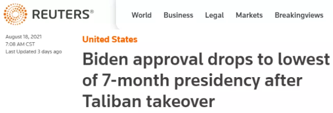 事实上,就连美国人也对自己的政府越来越不满意了。根据路透社和益普索最新公布的每周民调结果,在美国从阿富汗仓促撤军、阿富汗局势发生重大变化后,拜登的支持率从上周的53%下滑7个百分点,降至他上任以来的最低水平。