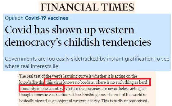 英国《金融时报》在《新冠病毒暴露了西方民主的幼稚倾向》中提到:不存在某一个国家可以独享的群体免疫。然而,西方国家却表现得好像国内接种疫苗就是他们的终点线,世界其他地区基本上被视为西方慈善的对象。这是严重错误的想法。