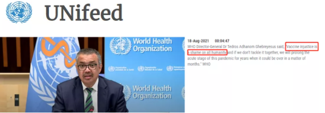 △联合国新闻网站截图。谭德塞在会上说“疫苗分配的不公平是人类的耻辱”