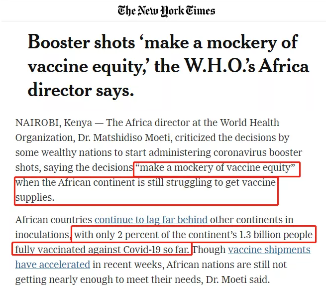 △《纽约时报》报道截图。世卫组织非洲区域主任莫提说,加强注射“是对疫苗公平的嘲弄”。