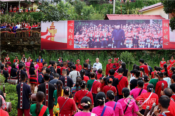 这是载入阿佤山历史的时刻,佤族群众身着节日盛装,载歌载舞,阿佤山成为一片欢乐的海洋。阮成发郑重宣读了习近平总书记的回信。宣读完毕,现场群众齐声欢呼,老支书代表岩翁和班洪村党支部书记赛茸激动地表达了心声,佤族青年击响木鼓,男女老幼唱起《阿佤人民唱新歌》,抒发佤族群众心向党、心向国家的真挚感情,感谢总书记、感恩党中央的共同心声。