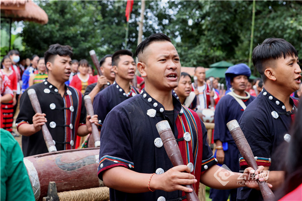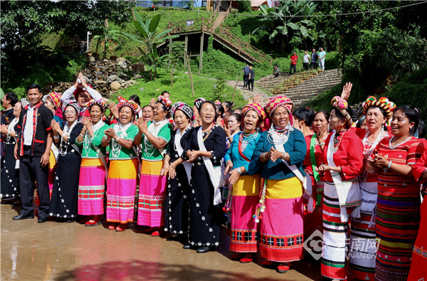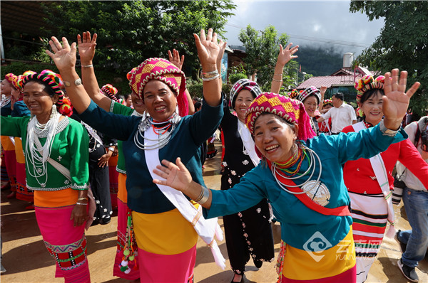 佤族群众身着节日盛装,载歌载舞,唱起《阿佤人民唱新歌》。记者 周灿 雷桐苏 摄