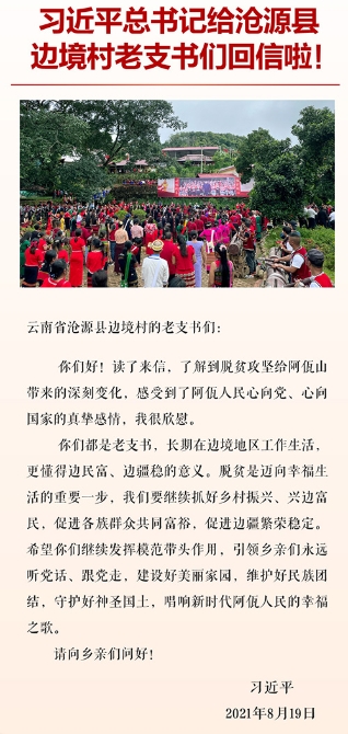 8月19日, 习近平总书记给沧源佤族自治县班洪乡、班老乡边境村老支书们回信,勉励他们发挥模范带头作用,引领乡亲们建设好美丽家园。回信的字里行间, 饱含暖暖真情,融汇切切关爱,充满了总书记对云南边疆少数民族群众的深情关爱、殷殷嘱托。