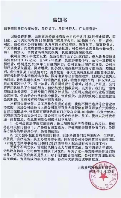 告知书称,因资金断裂,云南喜玛特已于8月23日停止运营,即日起,公司关闭现有的15家超市门店及子公司、DC物流中心,终止营业。对此,公司和公司管理团队再次向所有供应商、所有员工、所有投资人、广大消费者,向政府和媒体致以诚挚的歉意。对公司停止营业给合作伙伴、员工、投资人、消费者所带来的的损失,感到深深的愧疚。(掌上春城 实习记者白雨佳)