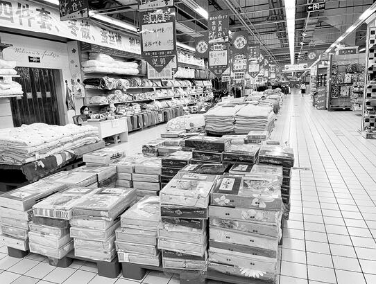 在超市内,床品、厨具、零食、蔬菜、衣服等商品都在打折出售,部分商品货架已经空了,有顾客在挑选商品,多为老年人。李阿姨告诉记者,她就住在附近,经常到喜玛特超市购物。