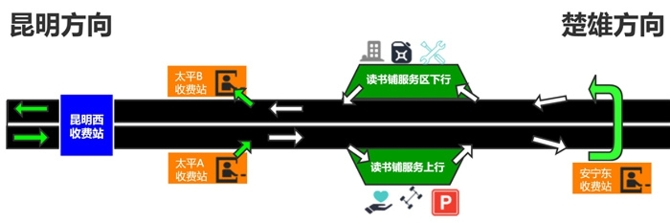 近日,云南交投集团在昆安高速读书铺服务区设置U转通行车道,即7座以下小型客车从昆明西或太平收费站驶入昆安高速下行线,可通过读书铺服务区专用车道实现掉头,由进入高速公路时的收费站驶离高速公路的一种便捷通行方式,同时实现车辆通行路径精准收费。
