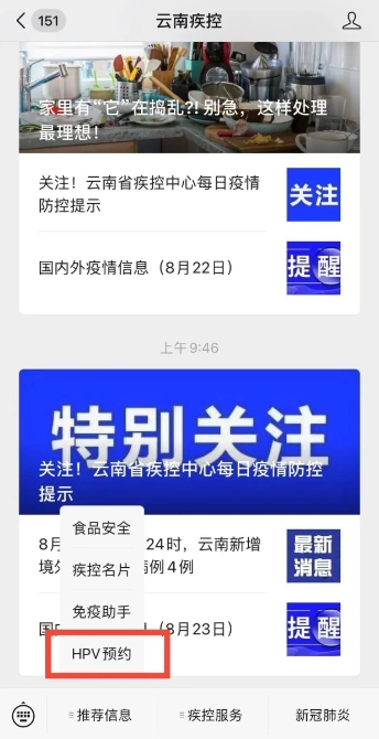 2、点击菜单"推荐信息"中的“HPV预约”;