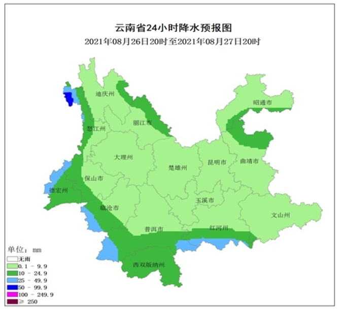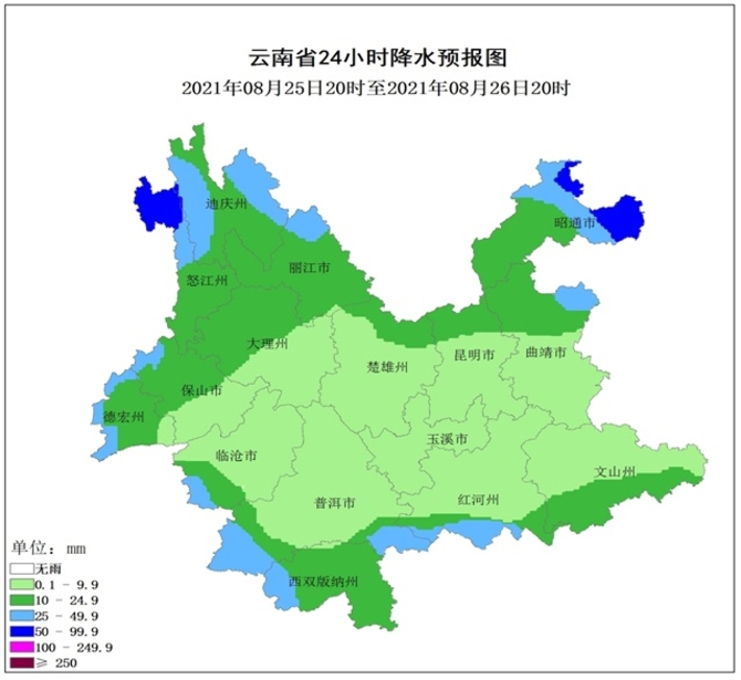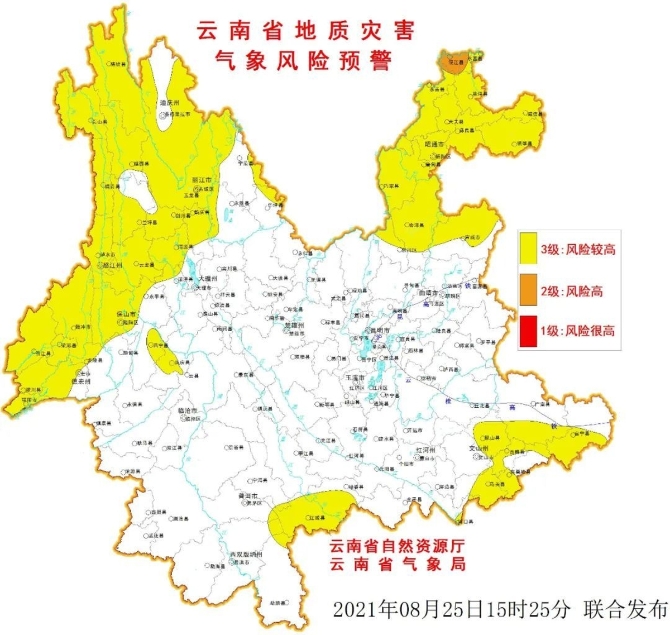 2021年8月25日20:00~8月26日20:00,滇东北昭通市局部发生滑坡泥石流的风险高;滇东北昭通市、曲靖市局部、滇西北怒江州、迪庆州、丽江市局部、滇西德宏州、临沧市局部、滇西南普洱市局部、滇南红河州局部、滇东南文山州局部发生滑坡泥石流的风险较高。