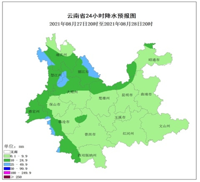 8月27日20时到8月28日20时:怒江、迪庆南部、丽江、大理北部、德宏、保山西部、临沧西部、普洱西南部多云间阴有中雨局部大雨,其他地区多云有阵雨局部中雨。