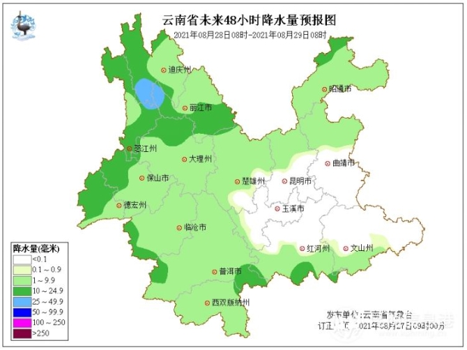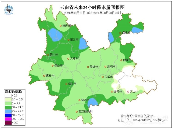 据了解,8月27日怒江、迪庆南部、丽江、大理北部、保山西部、德宏西部、临沧西部、普洱南部、红河西南部、昭通、曲靖北部阴有小到中雨局部大雨,曲靖南部、文山大部、红河东部多云间晴,其它地区多云有阵雨局部中雨。