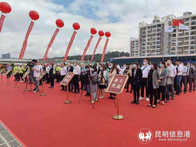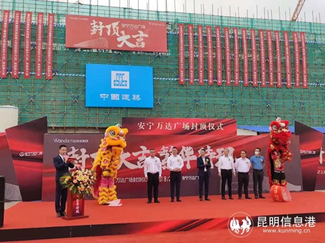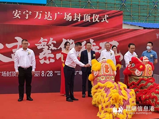 在舞狮迎宾的欢快节奏中,安宁万达广场商业部分封顶仪式正式开始。安宁万达地产开发有限公司工程副总经理巩生龙介绍了工程进度。